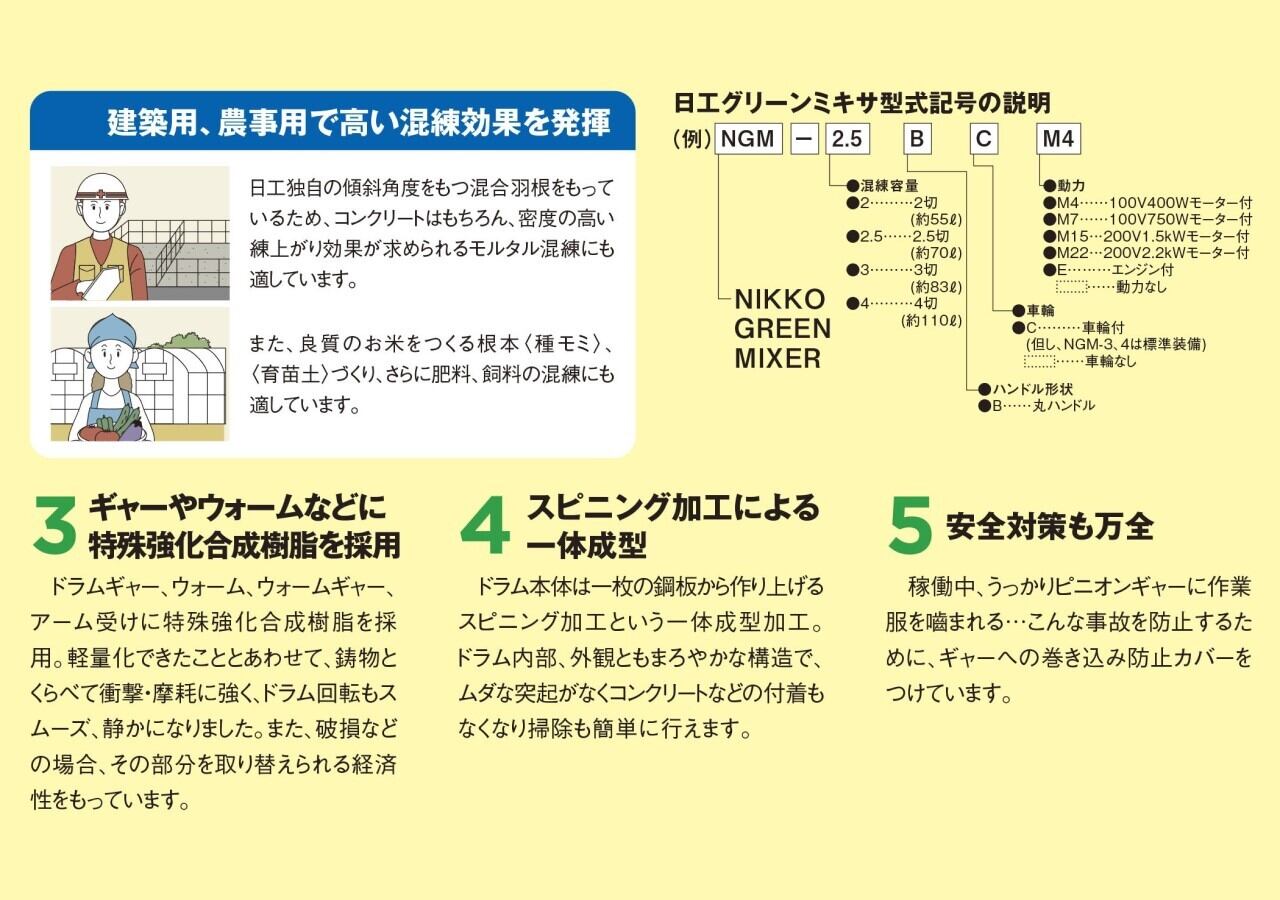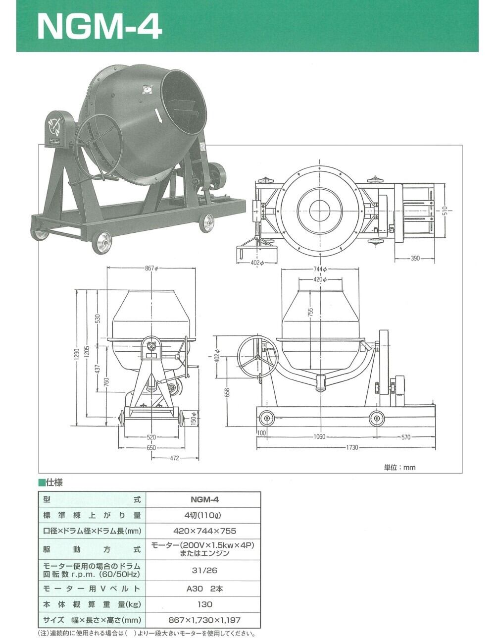 コンクリート混錬用 NGM-4M15 日工 トンボ グリーンミキサ コンクリートミキサ モルタル兼用 4切(110L)電動モーター式 車 小型 |トンボ工業
