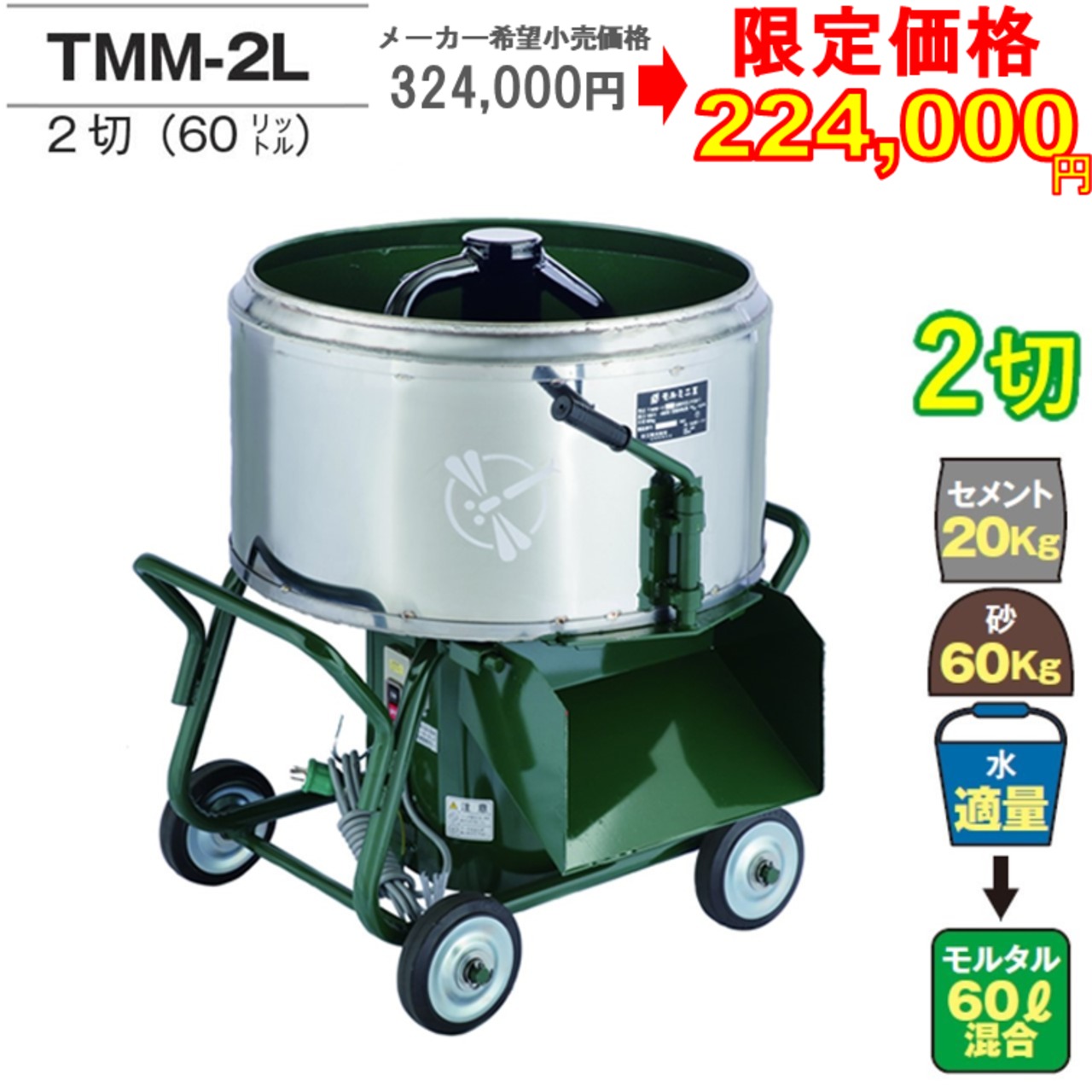 モルタル混錬用 日工 トンボ モルタルミキサTMM-2L (ドラム側面のみステンレス)(60L)小型 ロータイプ |トンボ工業